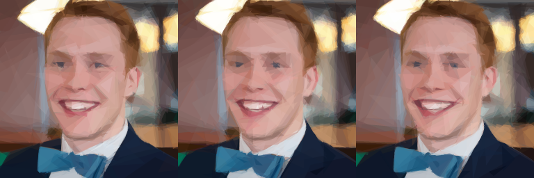 I generated three different versions of the same image using the JavaScript fork of Primitive and then stitched them together in Preview. This in itself was a bit of a hassle as you can’t change the canvas size without also resizing the image. You need to select all, cut the image, adjust image size to 300% width, then re-paste the first image and move to the left edge. You can then cut and paste the next two images alongside the first to fill the remaining space.
