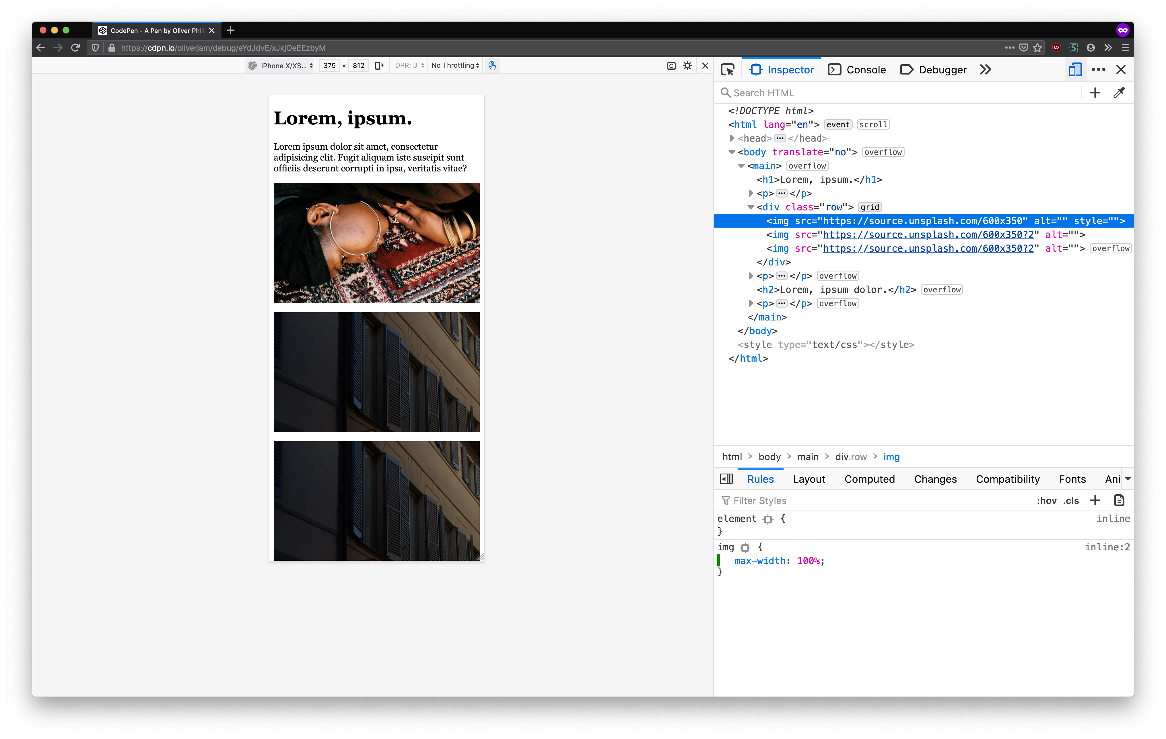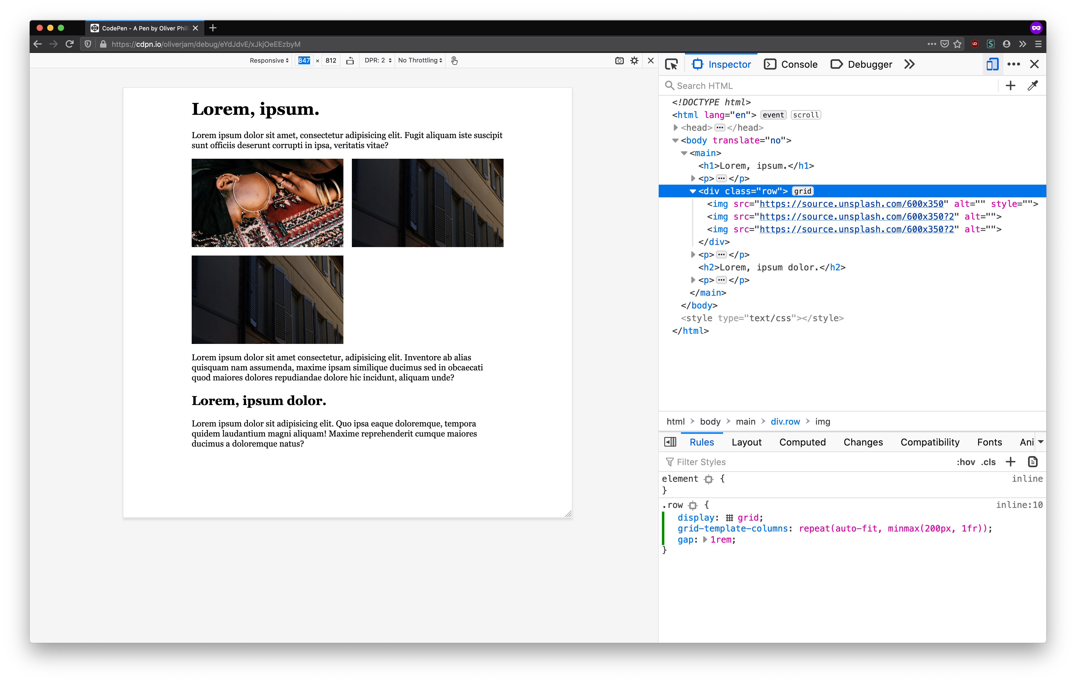 It would be nicer if we could tell the browser that we want to fit images all in a row, as long as they don’t shrink below some minimum size. We can achieve this using CSS grid. First we need to wrap the images in a container element: