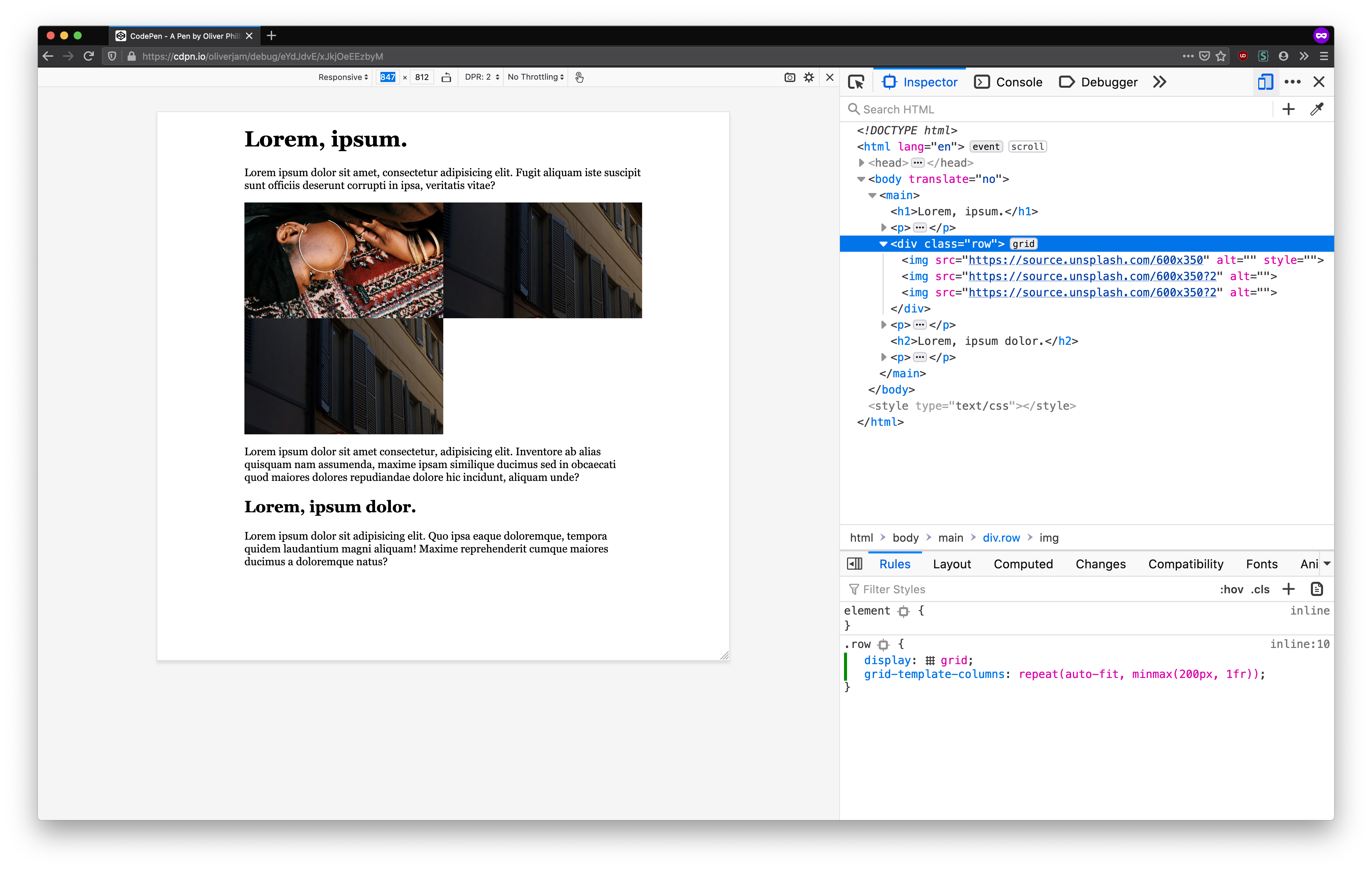 This creates two equal size columns, since the fr unit means “fraction of the available space”. However this only works if there are two images. It also won’t work on mobile since the two columns will be too small when the viewport is narrow.