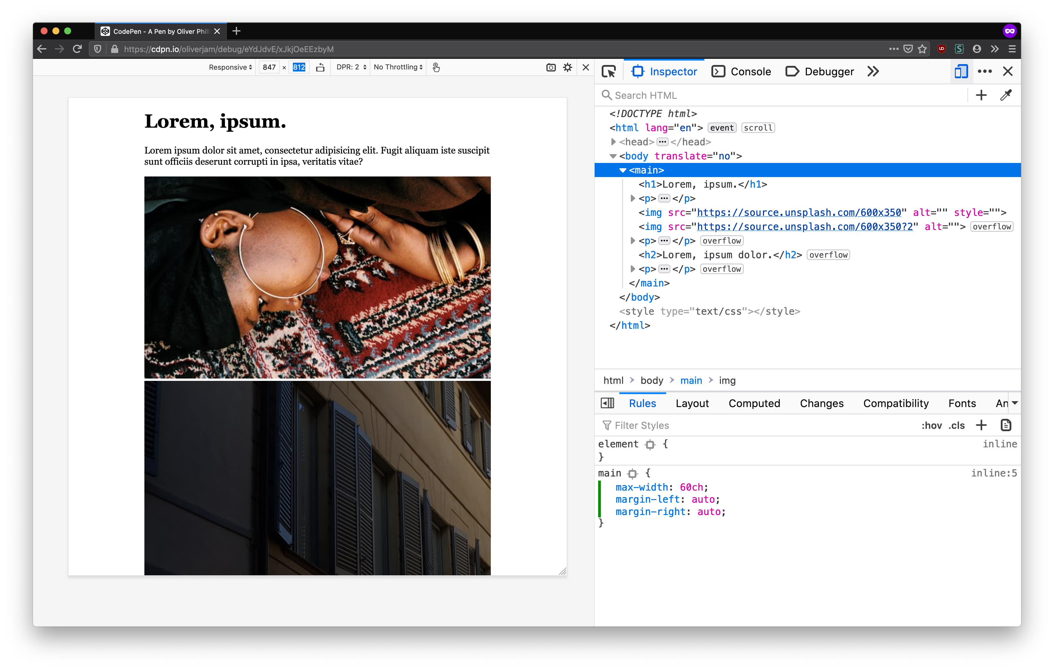 This rule tells the browser to prevent the <main> from growing larger than 60 characters wide.