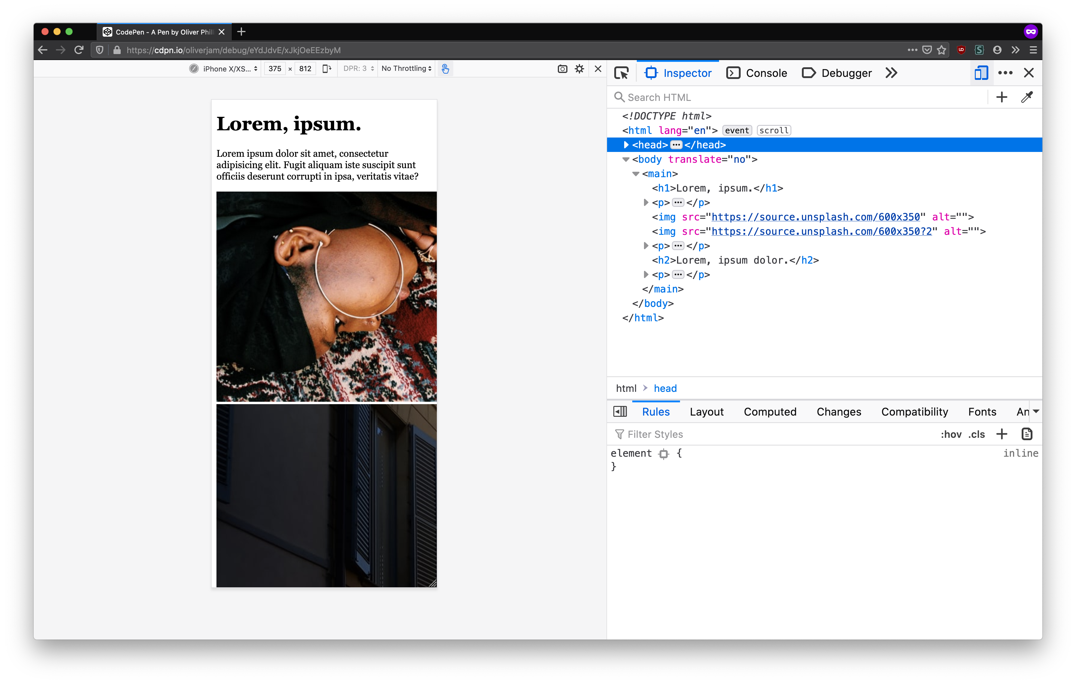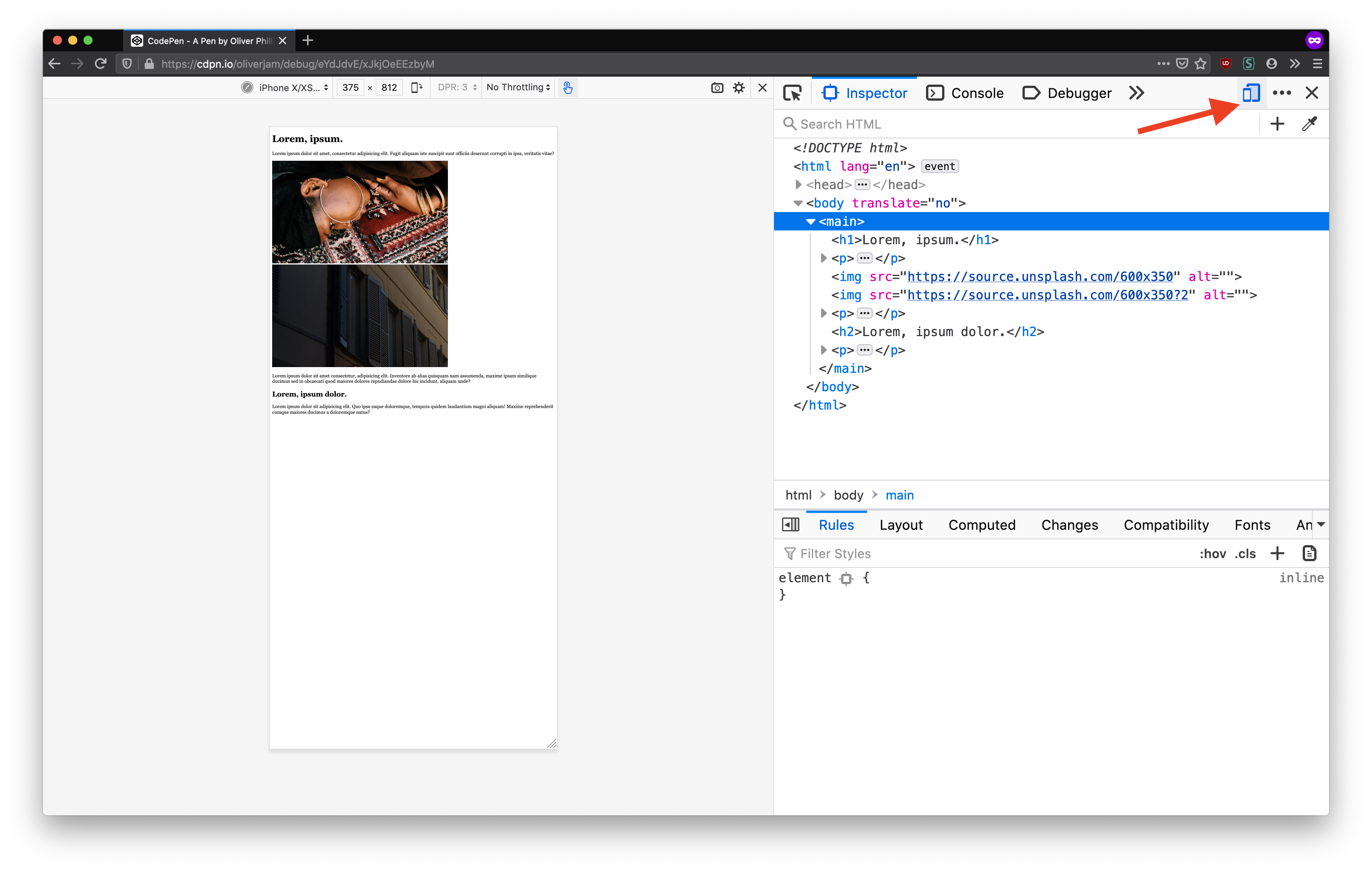 We can use our browser’s developer tools to simulate a mobile device, to see how this would look on a smaller screen. In Firefox this button is at the top right of devtools (in Chrome it’s at the top left).
